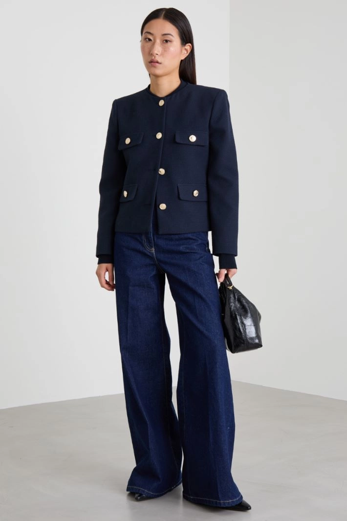 Straight-fit jacket in cotton blend woven fabric, with a crew neck, long sleeves and fake pockets with flaps and buttons. Single-breasted fastening with metal buttons. Lined garment.