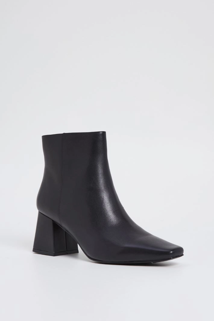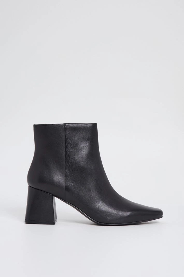 Ankle boots in genuine leather with a shiny finish, square toe and trapezoid heel. Zip on the inside and rubber sole.
