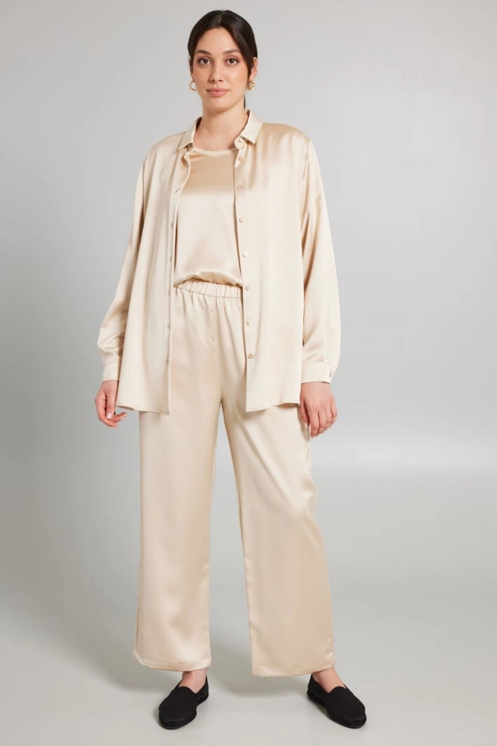 Straight, loose-fit satin trousers with elastic insert at the waist and inset side pockets.