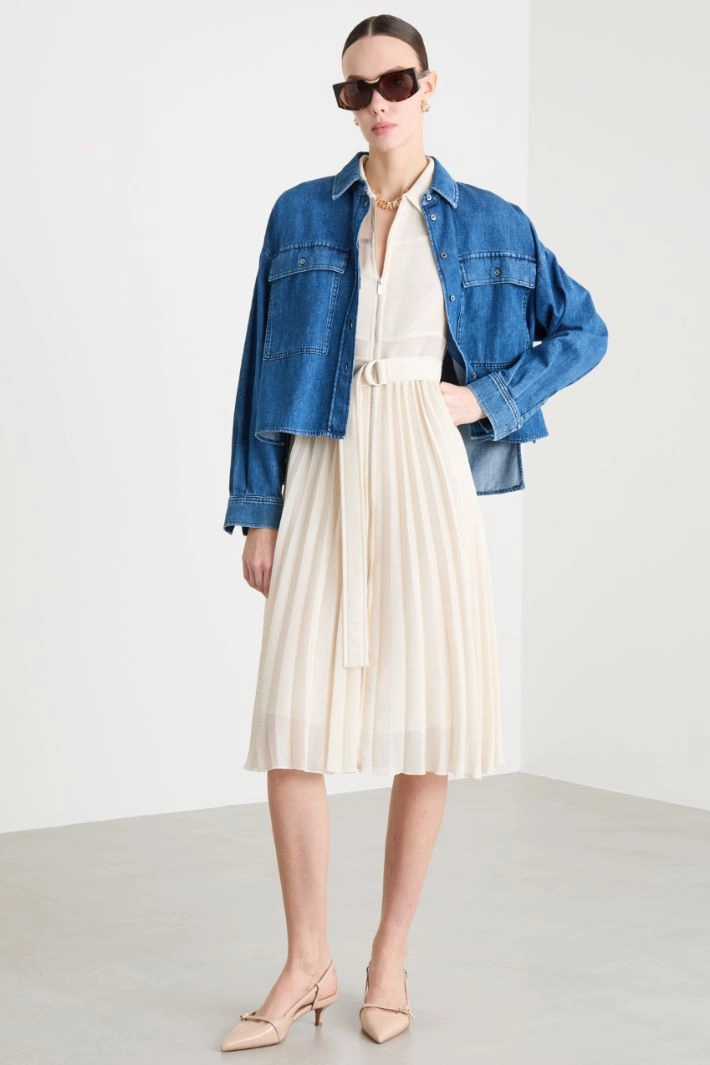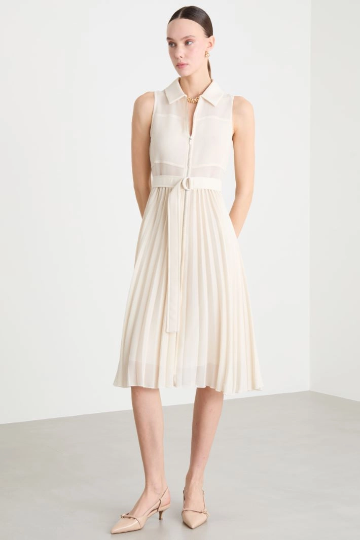 Slim-fit shirt dress in viscose-blend technical mesh, with a pointed collar, wide shoulder straps and a sunray-pleated skirt. The close-fitting bodice features a side zip. Fastening with a two-way zip on the front and a belt.