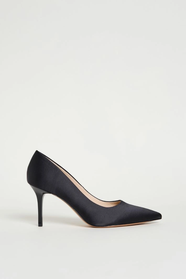 Satin pumps with a pointed toe, leather lining and a slim lacquered heel. Natural leather sole with a rubber inlay.