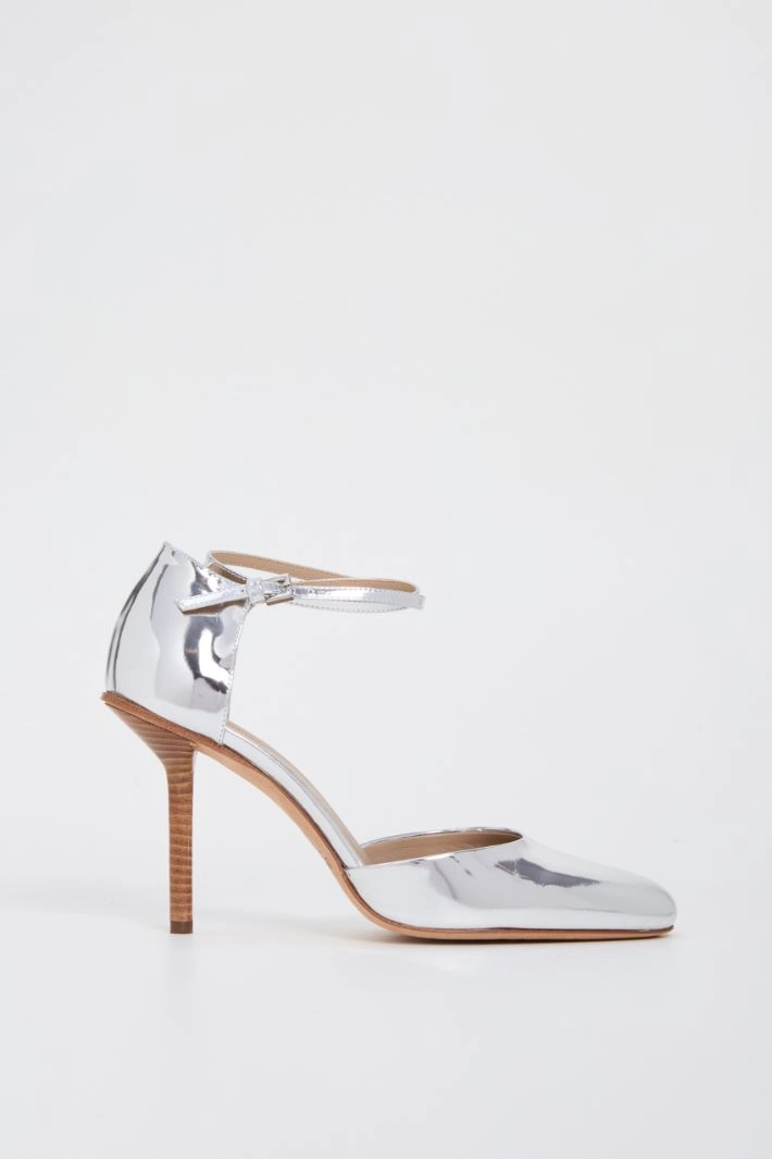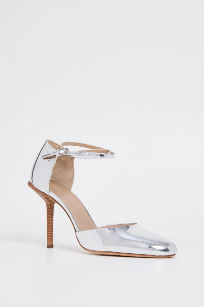 Genuine leather sandals with a metallic finish, with a crossed ankle strap adjustable with a buckle. Rounded toe and thin leather heel. Leather lining, leather sole.