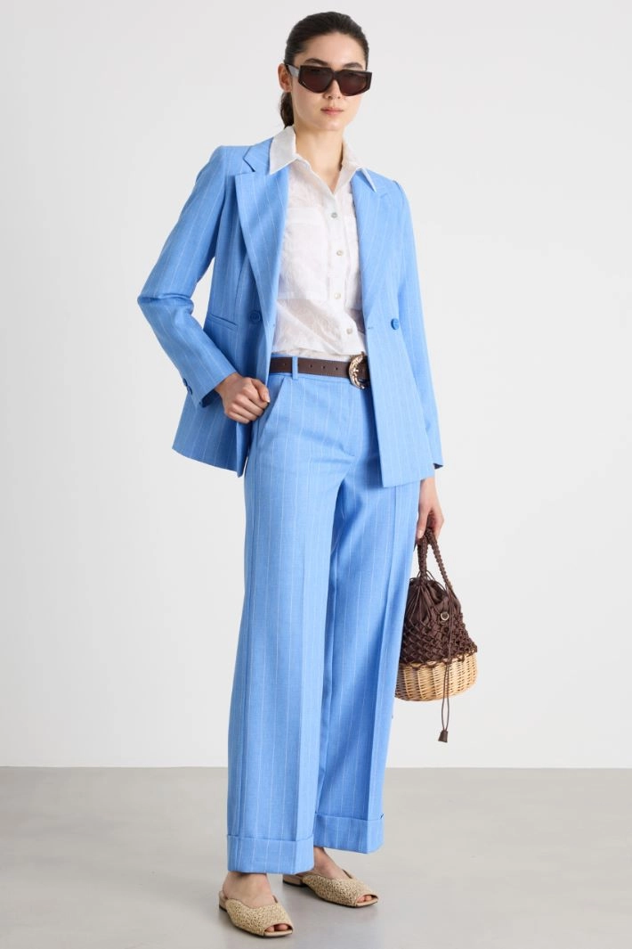Straight-leg trousers in pinstripe basketweave, featuring belt loops, front slant pockets and rear welt pockets. Finished with turn-ups and a concealed button and zip fastening.