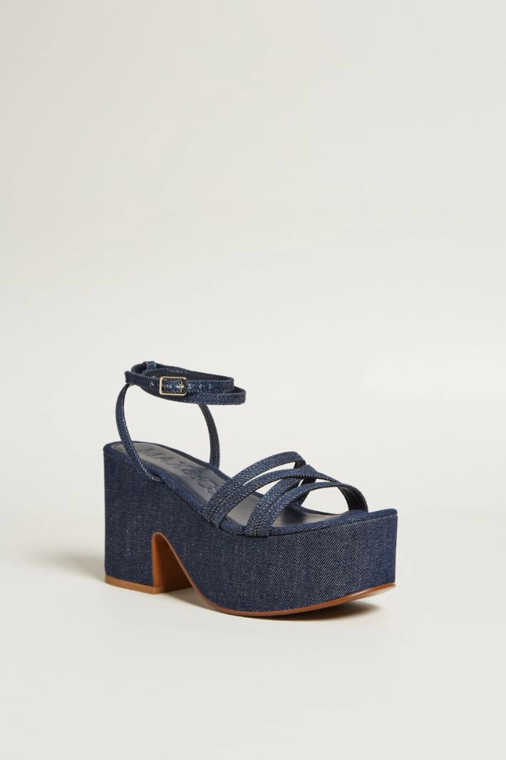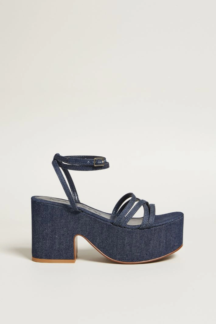 Sandals in pure cotton denim, with crossed straps, platform sole and ankle strap closure. Rubber sole.