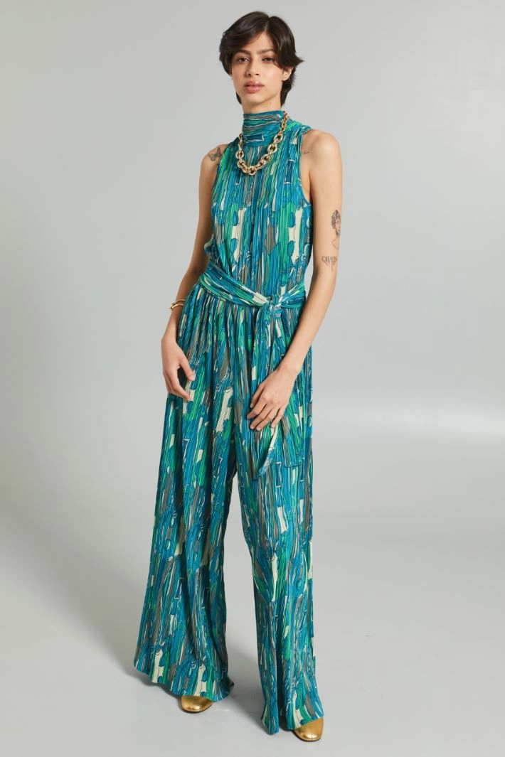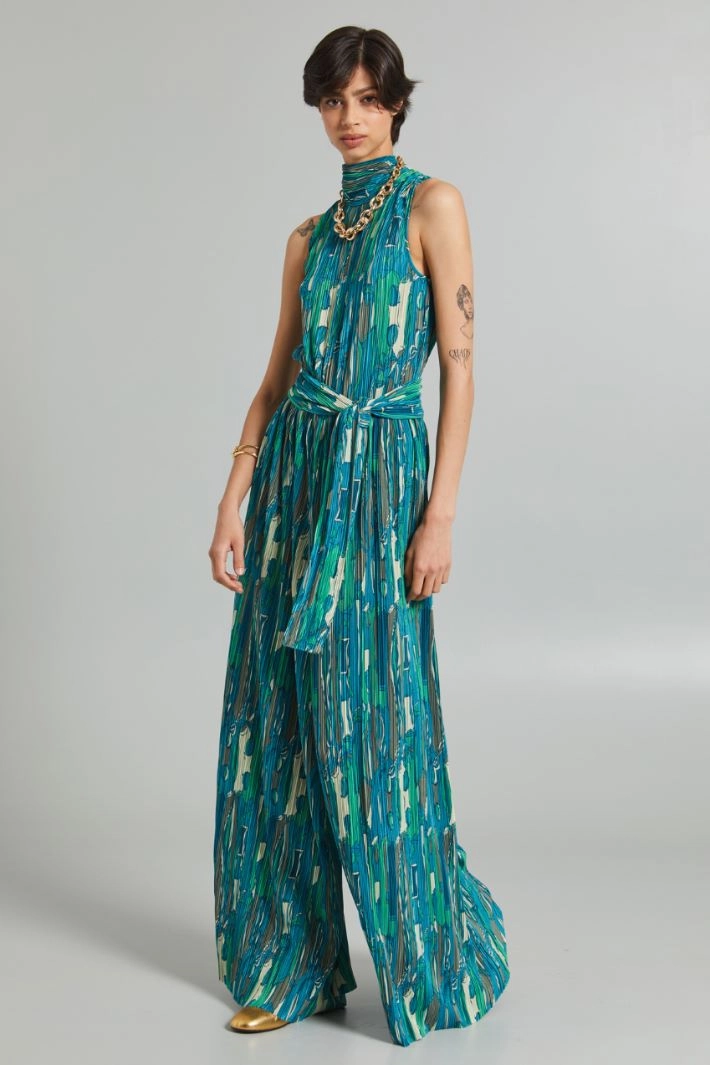Loose fit sleeveless jumpsuit in pleated jersey with a shiny finish, with halter neckline finished with ribbons to tie on the back, elastic insert at the waist and V-shaped opening on the back. Matching belt.