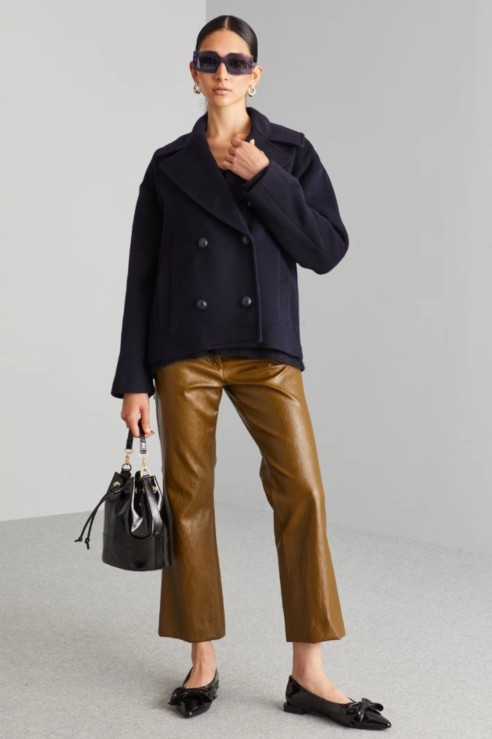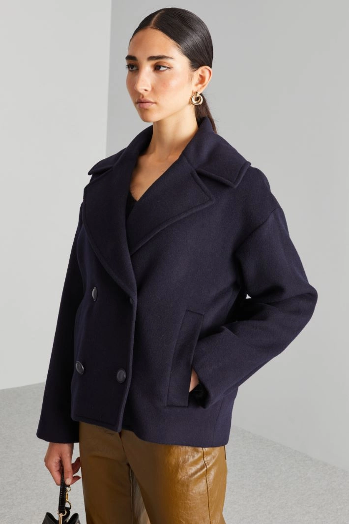 Straight-cut pea coat in pure wool cloth, with wide lapel collar, long sleeves with zip, side welt pockets and double-breasted button fastening. Lined.