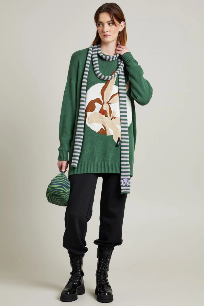 Scarf in pure cotton yarn with yarn-dyed stripes, with embroidered patchwork at the bottom and ribbed edges.