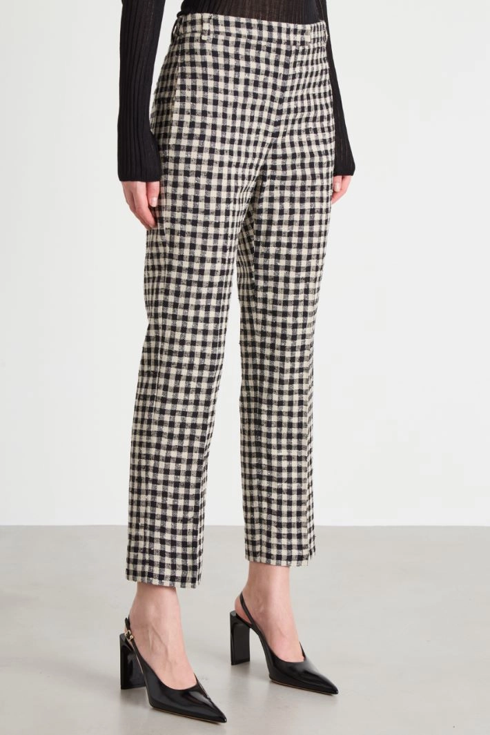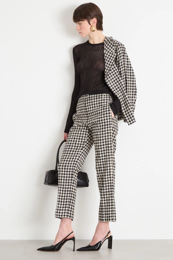 Straight-fit trousers crafted in a cotton and silk natté with a classic gingham pattern, featuring belt loops, side seam pockets and welt pockets on the back. Concealed zip and hook fastening.